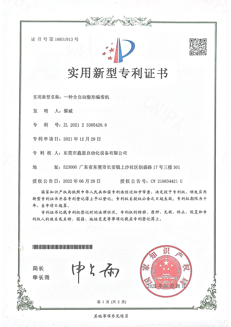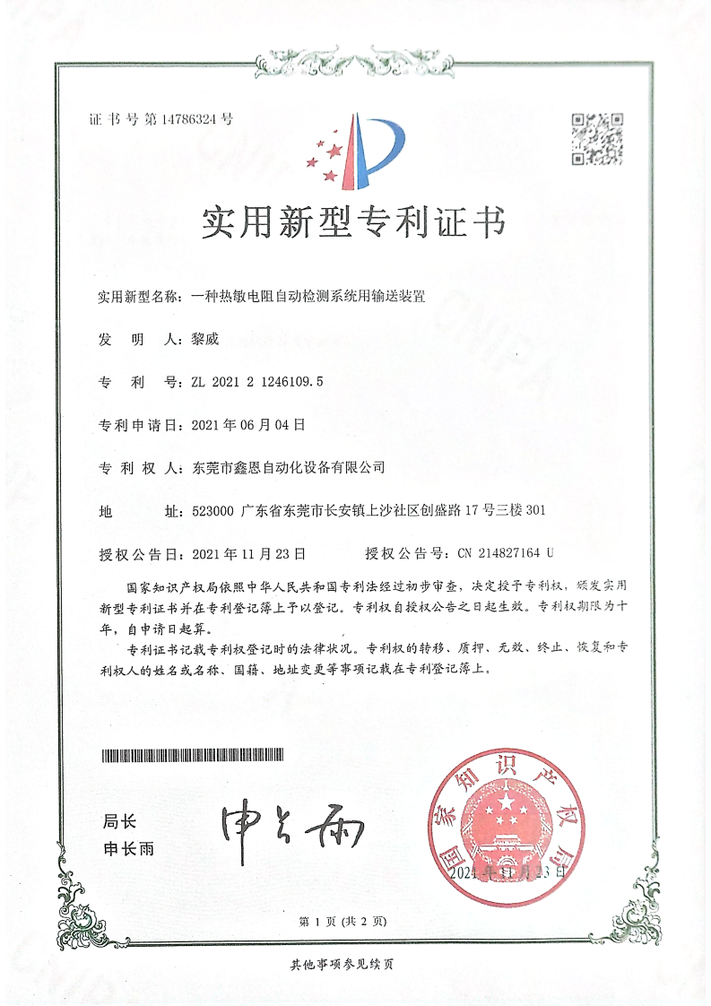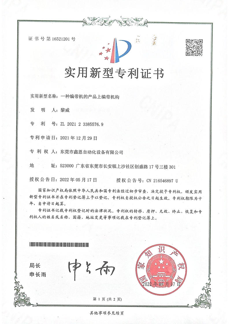 实用新型专利证书