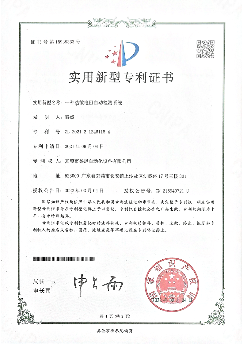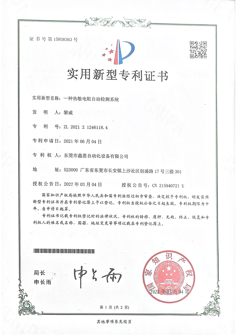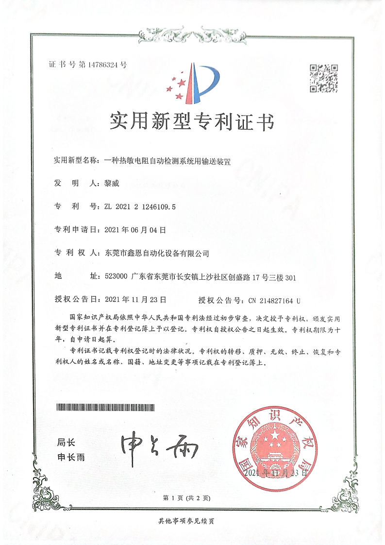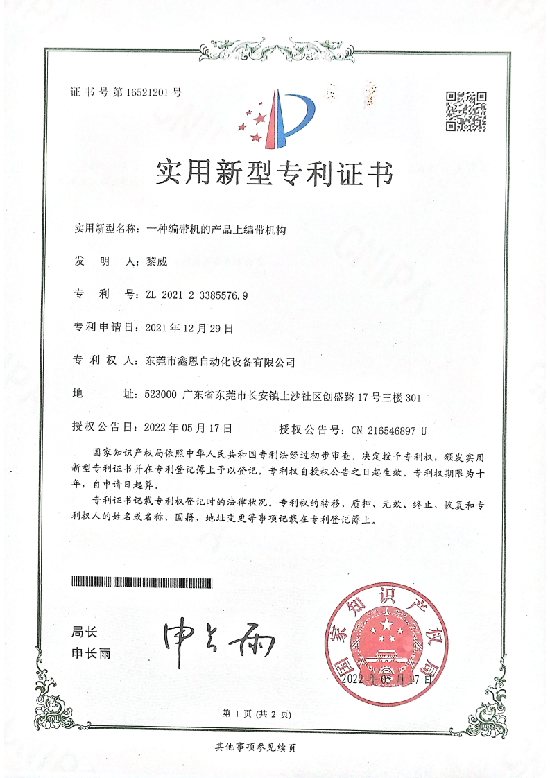 实用新型专利证书